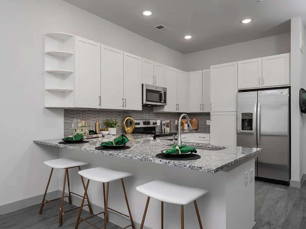 Stepping into our one and two-bedroom homes, you’re greeted with an atmosphere of sophistication. Expansive floor plans, complemented by 10-foot ceilings and private patios or balconies, serve as the ideal canvas for your life. At the heart of each home, kitchens adorned with custom shaker-style cabinets, gleaming tile backsplashes, large islands, and cozy breakfast nooks stand ready for culinary masterpieces.