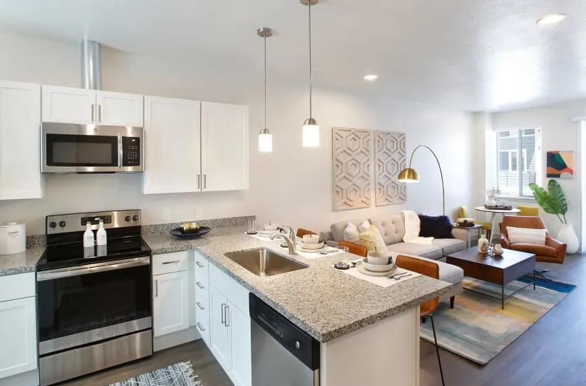 Generous furnished one and two bedroom apartments within a new development in Salt Lake City, Utah. Located just south of Downtown SLC by I-15 and I-80, the development is ideal for Central Pointe Station, Times Square business park, Salt Lake County Government Center, U of U Health Redwood Health Center, Sugar House Park and The University of Utah.
