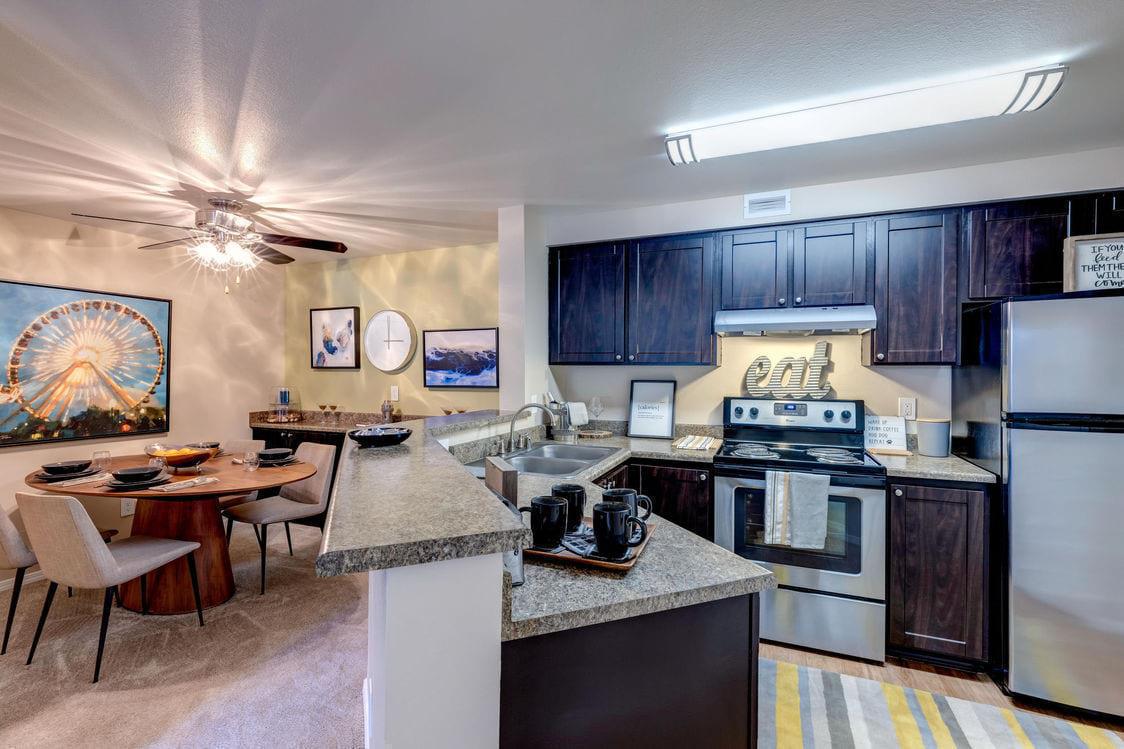 Apartments can feature ceiling fans, wood floors, quartz counters, golf course views, vaulted ceilings and stainless steel appliances. The development can feature a pool, playground, dog park, landscaping, nature trail, media room, clubhouse and parking garage.