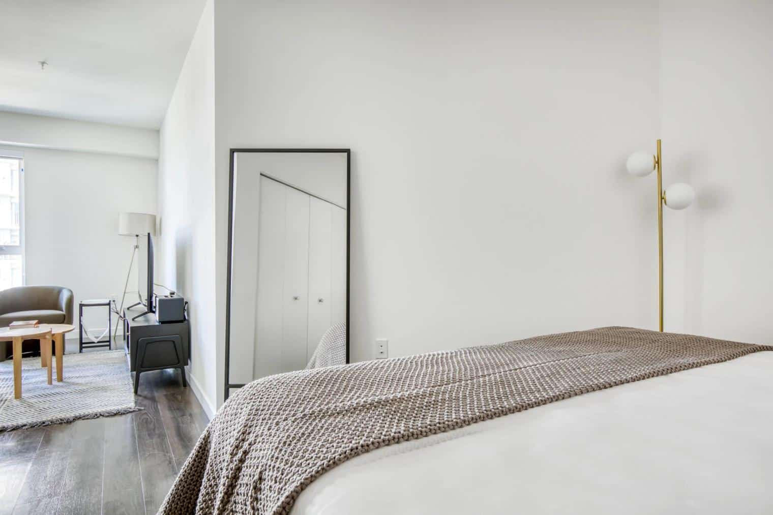 The private bedroom area includes a king size bed, standing mirror, end tables, large closet, and more. The bathroom is spacious, with designer tile and cabinetry, and premium plumbing. The kitchen as well features designer tile backsplash, sleek cabinets, stainless appliances, and modern lighting.