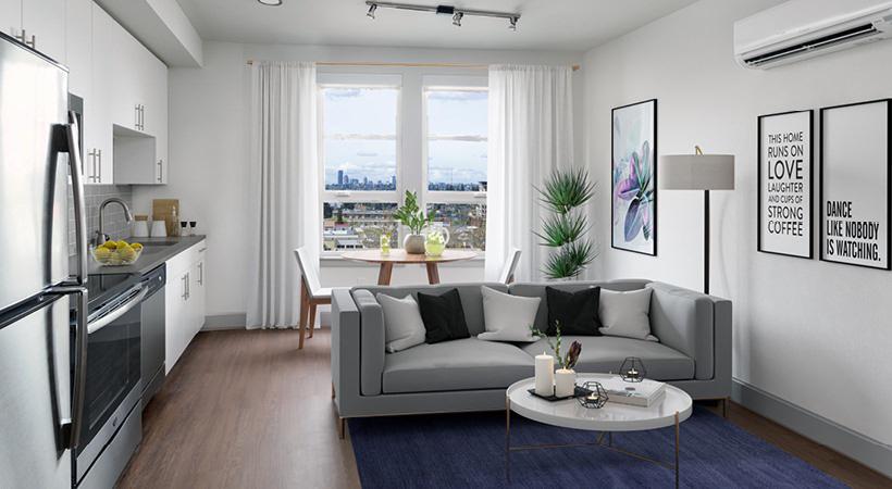 Apartments can include wood floors, spacious closets, patio or balcony, stainless steel appliances and quartz counters. The development can include a rooftop terrace, cyber café, 24/7 fitness center, bike repair and storage, WiFi, BBQ area, elevators and parking garage.