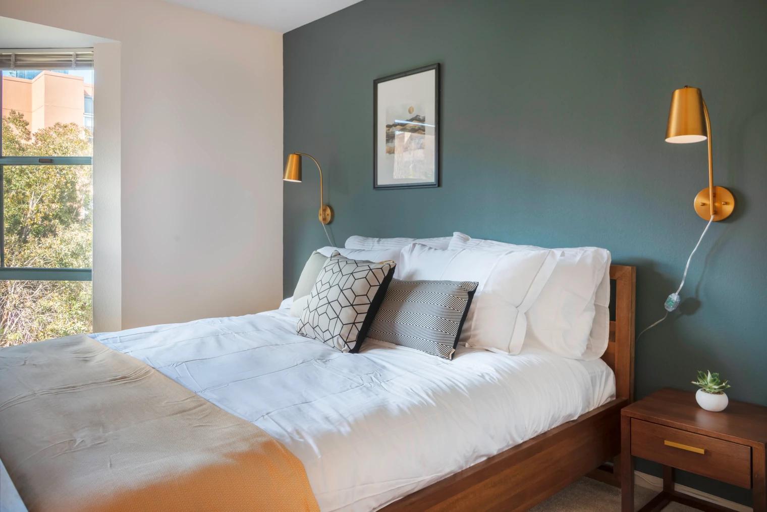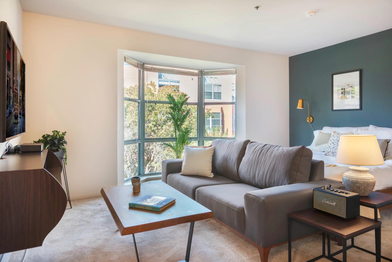 Available from $3,080/month, this fully-furnished studio has everything you need. Full stainless kitchen appliance package, queen size bed, wide-screen TV and Marshall speaker in the living room, dining table, closets, and more! Towels and linens are included. Between the accent paint and stunning interior design, studio living never looked so good. And this unit is pet-friendly!