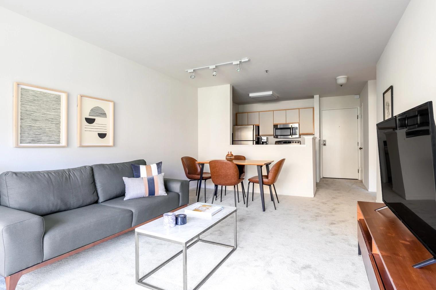 Unit #322 boasts 2 bedrooms and 2 bathrooms at 916 square feet. Available from $5,340/month. Fully-furnished and pet-friendly, from the moment you walk in you will feel at home. Furnishing includes 2 king size beds, dresser, end tables; full stainless appliance package in the kitchen; dining set; sofa and lounge chair, coffee and console table, large TV and speaker in the living area; and a private balcony with seating. Spacious bathrooms, large closets, linens and towels included.