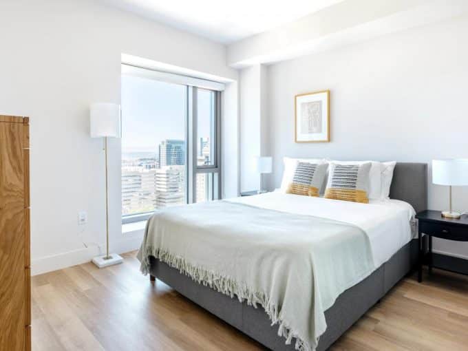 The living room is spacious and includes a smart TV and Marshall speakers. Large windows provide natural light with sweeping views of Chinatown. The bedroom features a premium king size bed with complementary luxury linens. Bathroom is large, with plenty of storage and counter space. You will relish the in-unit laundry and several storage closets throughout!