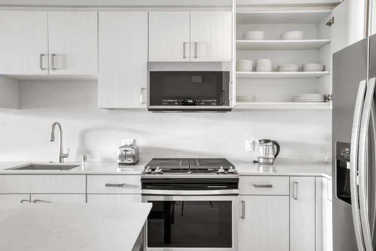 Unit #1165 is a lovely 1 bedroom, 1 bathroom, 795 square foot apartment with all the features to make you feel right at home. Available from $3,990/month. Open-concept and ample lighting make this unit inviting. The cozy living room features a wide-screen TV and Marshall speaker. There is a working desk with chair and lamp, and a separate dining area. The designer walk-through kitchen features full stainless appliance package and island bar. Bedroom includes a luxurious king size bed, walk-in closet, dresser, and more. You will love the convenience of in-unit laundry, with linens, towels, and ironing set included.